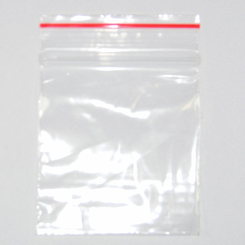 Clear zip lock plastic satchel bags with red line printed high edge. Made up of superior quality plastic. 100 pieces in each package. Size: 50 mm X 50 mm.